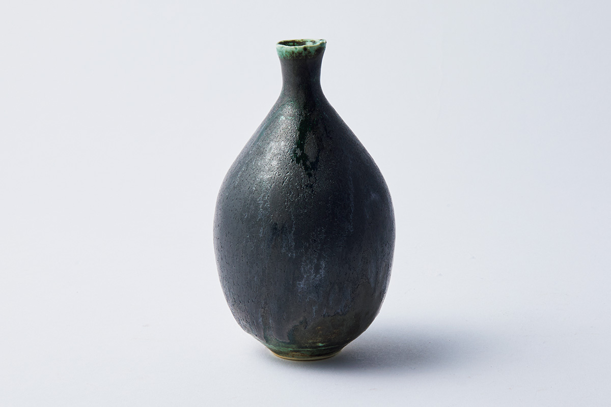 落ち着いた色みを出すため、低い温度で焼成。一見ブラウンに見えるが、生命力をたたえた種のように緑色がちらりとのぞく。一輪挿しはもちろん、細い枝の花を数本飾っても◎。