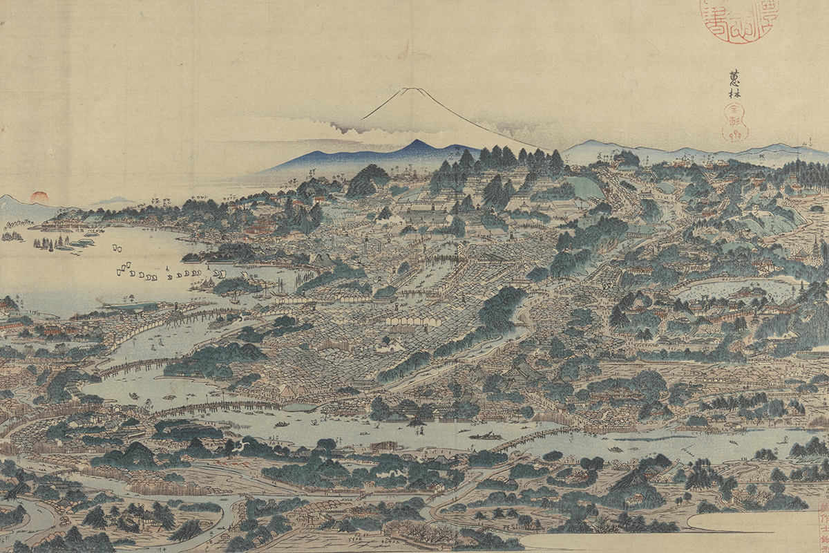 『大江戸鳥瞰図』の手前の川は隅田川で、両国橋や大川橋が架かり、奥には日本橋と江戸城が描かれている