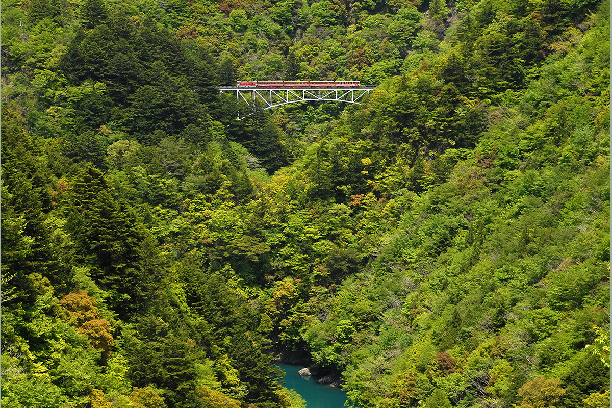 井川線(南アルプスあぷとライン)は、大井川水系のダム建設のためにつくられた歴史をもち、急勾配を上るための鉄道システム「アプト式鉄道」が走る日本唯一の路線。写真の奥大井湖上駅や、川の水面からの高さが日本一の鉄道橋・関の沢橋梁など、山岳鉄道ならではの見どころが豊富で、紅葉や新緑の季節の美しさは格別だ。