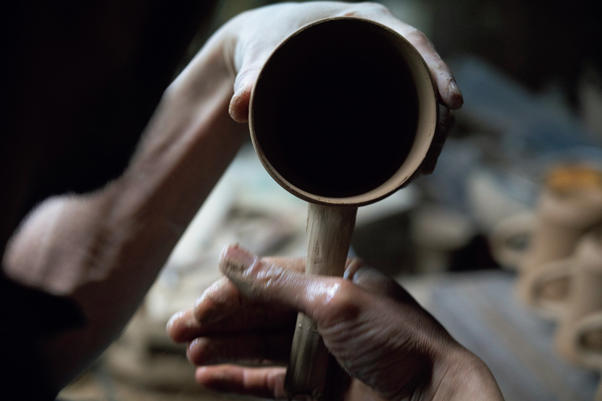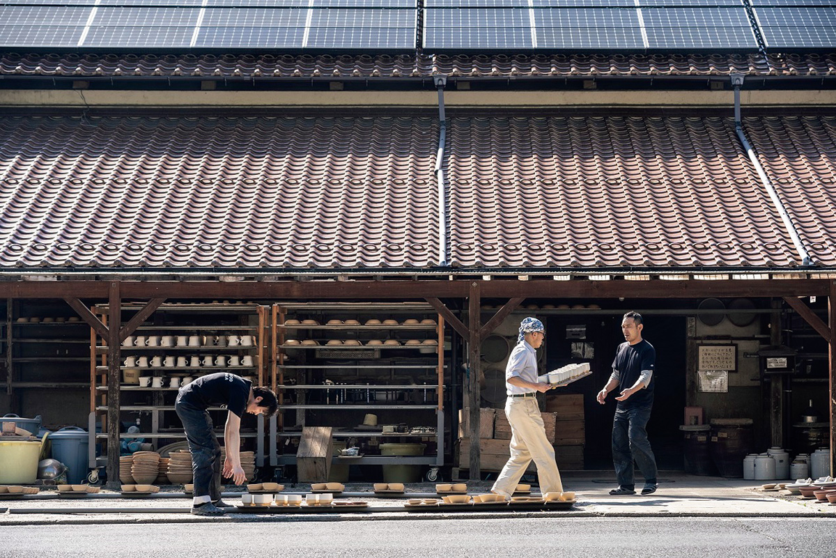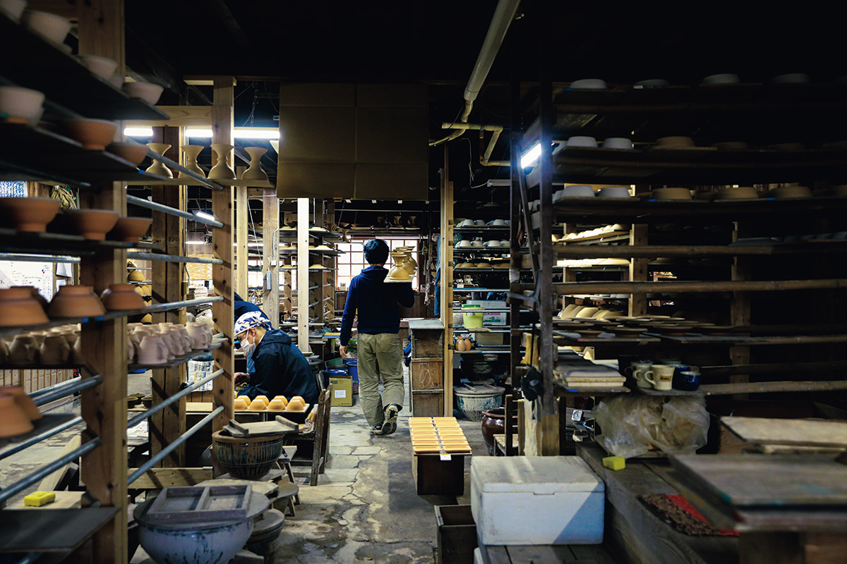 現在、陶器の製造に携わるのは、研修生を含め16名。作業は分業制ではなく、一人の陶工がろくろ挽きから成形、装飾、焼成に至るまで、一貫して行っている。