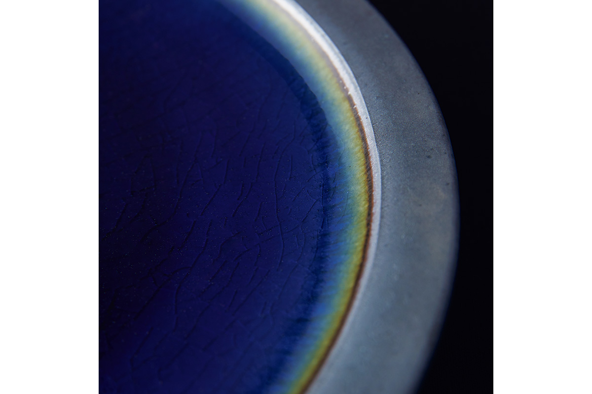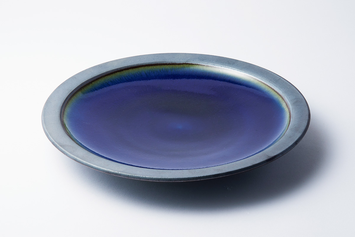 出西窯の顔ともいうべき皿。縁の釉薬と内側の釉薬が混ざり合って生まれる青とグリーンのグラデーションが幻想的。深過ぎず、浅過ぎない、ほどよい形状で使いやすい。