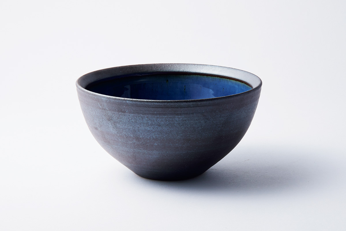 30~40年前にお客から依頼を受け、製作されたボウル。外側の鉄砂釉(黒)と内側の呉須釉(青)のコントラストが斬新。メインのうつわとして、または丼鉢としても重宝する。