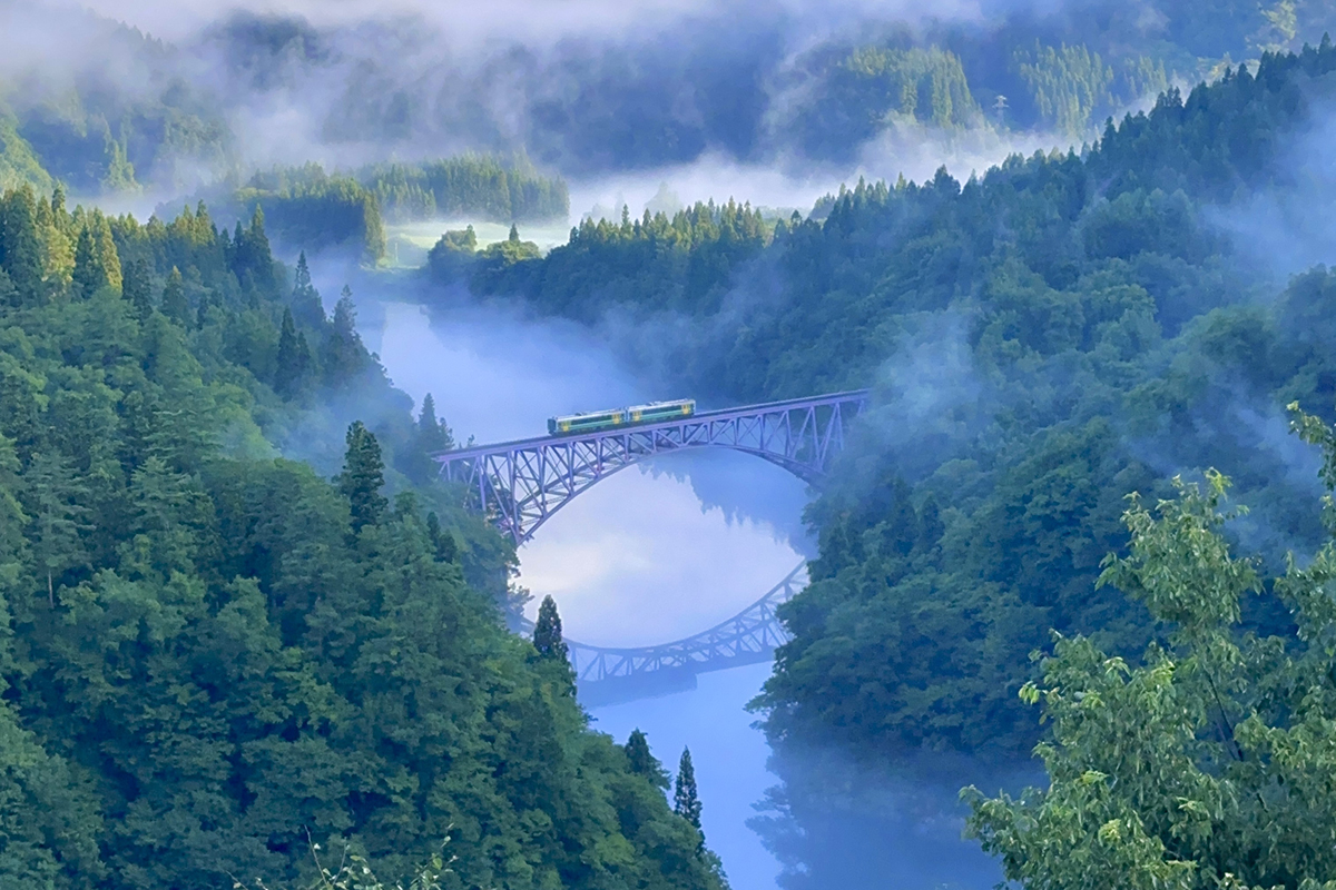 福島県の会津若松駅から新潟県の小出駅まで全長約135㎞を結ぶ。只見川に沿って走り、「第一只見川橋梁」など数々の橋梁と渓谷美を楽しめる。写真は山岳景勝地・大志集落付近を走行中の一枚だ。