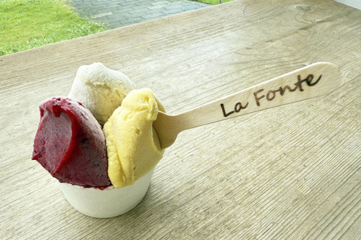 奄美大島北部にある「いずみ農園」直営の人気ジェラテリア「La Fonte」(ラフォンテ)。農園で栽培されたフルーツをはじめ、奄美産の野菜や黒糖、海塩などを用いたジェラートが常時約10種類ショーケースに並んでいる。ジェラートはすべて店内のキッチンで手づくりされたもの。奄美の豊かな自然を感じさせる味わいだ。