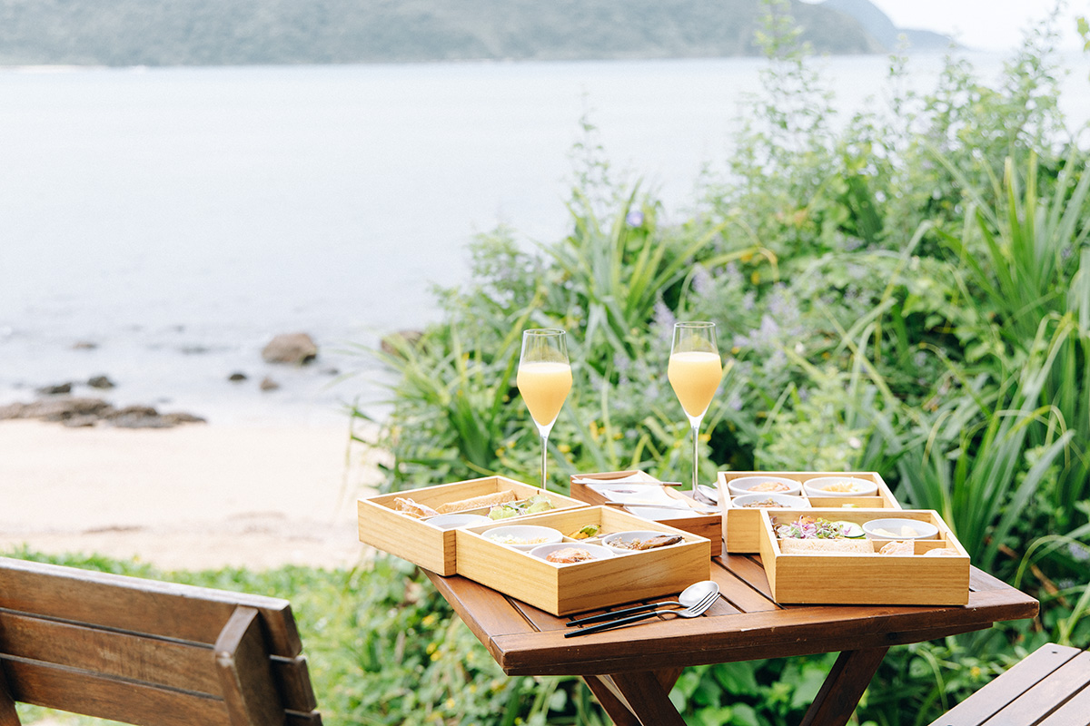 中でも赤木名の海辺に位置する「伝泊 The Beachfront MIJORA」では、奄美⼤島の⾃然に寄り添い、心身をリフレッシュさせる滞在を提案。波の音で目覚めたらビーチやテラスにテーブルを広げ、隣接するレストラン&バー「2 waters」がつくる朝食をいただこう。