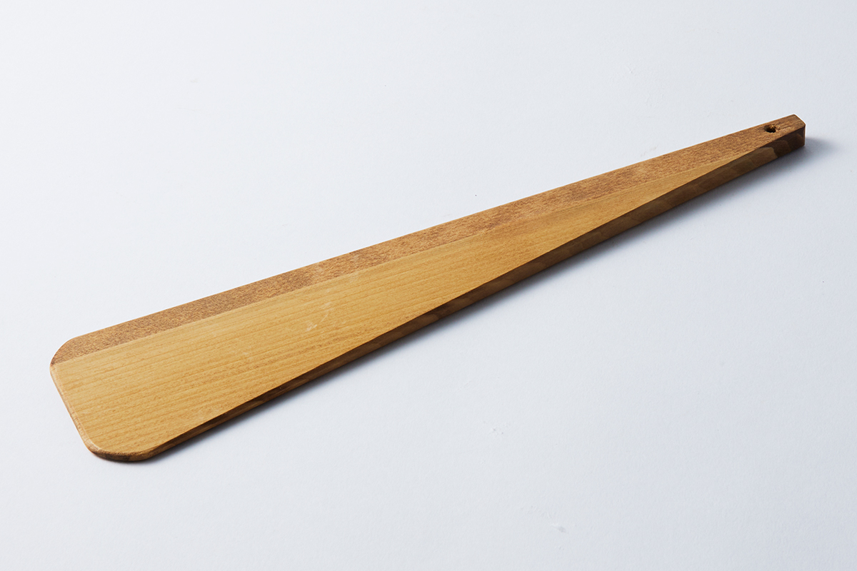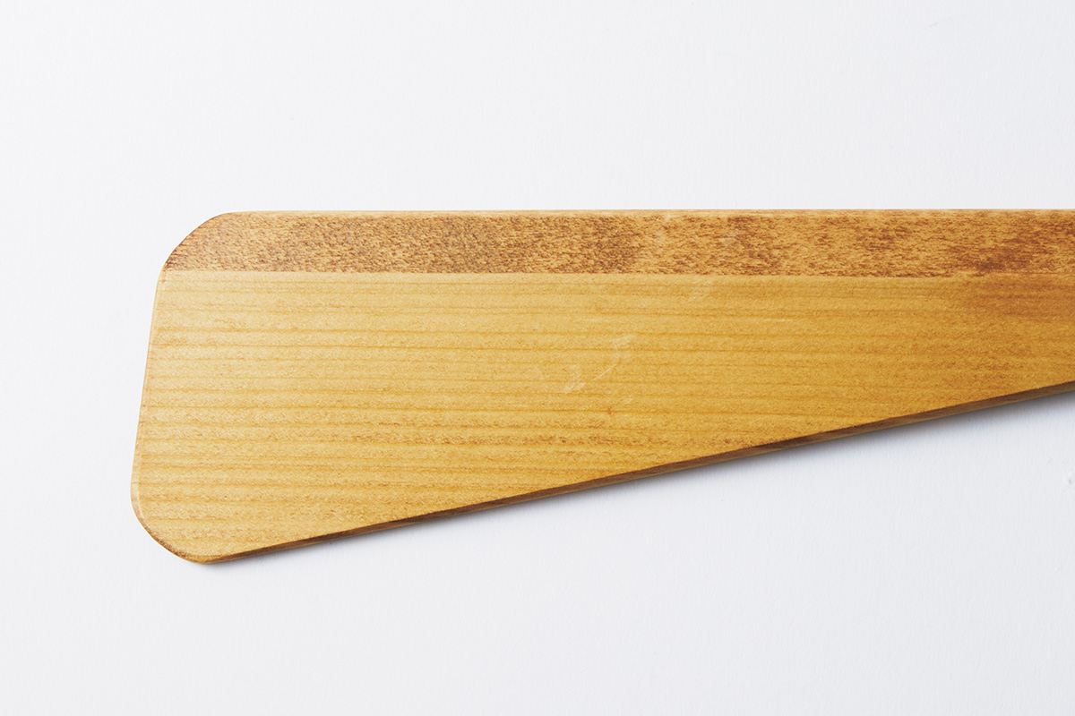 輪島塗職人が下地塗りをする際に使用する道具をアレンジ。軽くて手にフィット。漆を塗り、布で拭き上げているため(拭き漆)、調理時の色移りや匂い移りも気にならない。