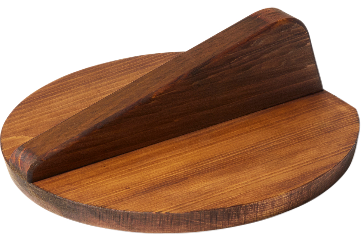 漆を保存する容器の蓋から着想を得てつくった、料理用の落とし蓋。調理中に立てて一時置きできるように、平らな面を設けている。拭き漆ならではの木目の美しさが特徴。