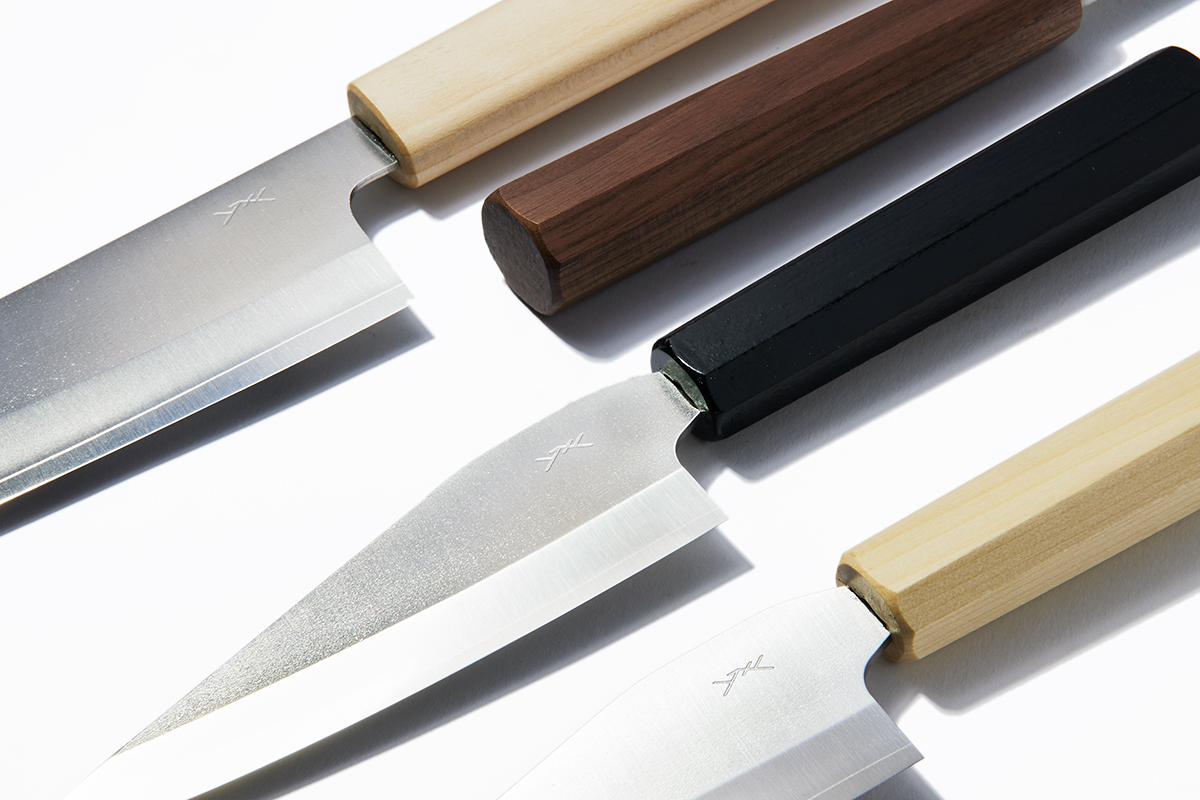 「Sharpening four」は、同組合の研ぎ師でもある戸谷祐次さんが父から引き継ぐ際に新たにした屋号。新ブランド「癶」は、プロダクトデザイナーの江口海里さんとの出会いから誕生した。「代表作の『HATSU』シリーズは、とにかくシンプルな方向でいこうと決めました」と戸谷さん。伝統工芸でありながらモダンなデザインは、現代のキッチンと好相性。「これから料理をはじめる方にも使ってほしいですね」。