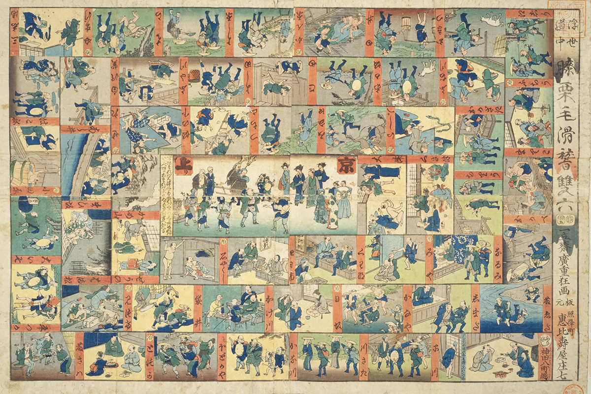 “道”をテーマに、マス内に宿場町の光景や名物などが描かれたすごろく。五街道の整備が進むと同時に、街道や全国各地の名所を題材につくられるようになった。中でも多かったのが東海道をめぐる「東海道双六」で、江戸・日本橋を出発点として西に向かって進み、京都で上がりとなるもの。コマを進めるたびに、旅の道中への想像が膨らんでいく。