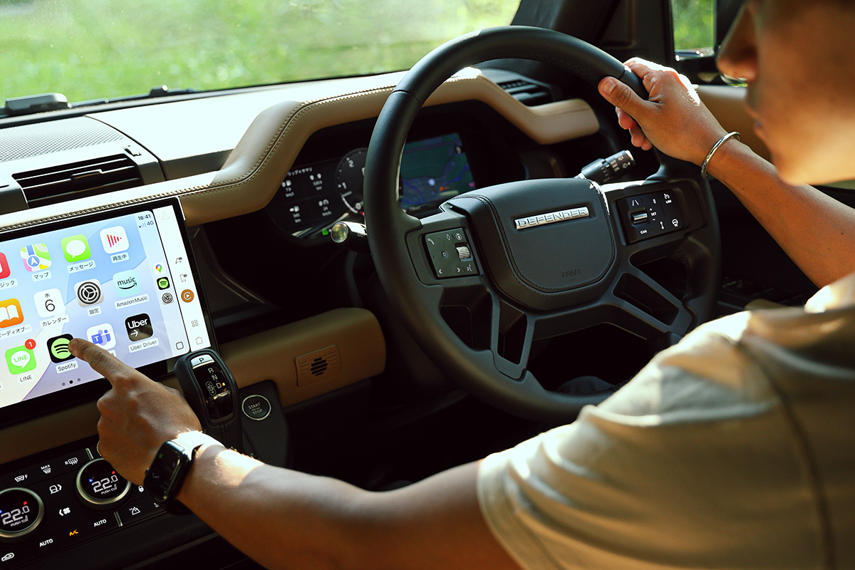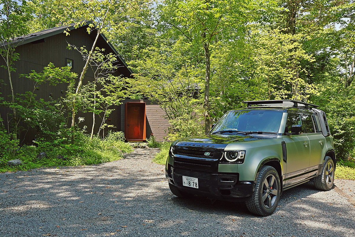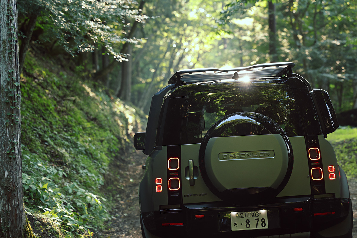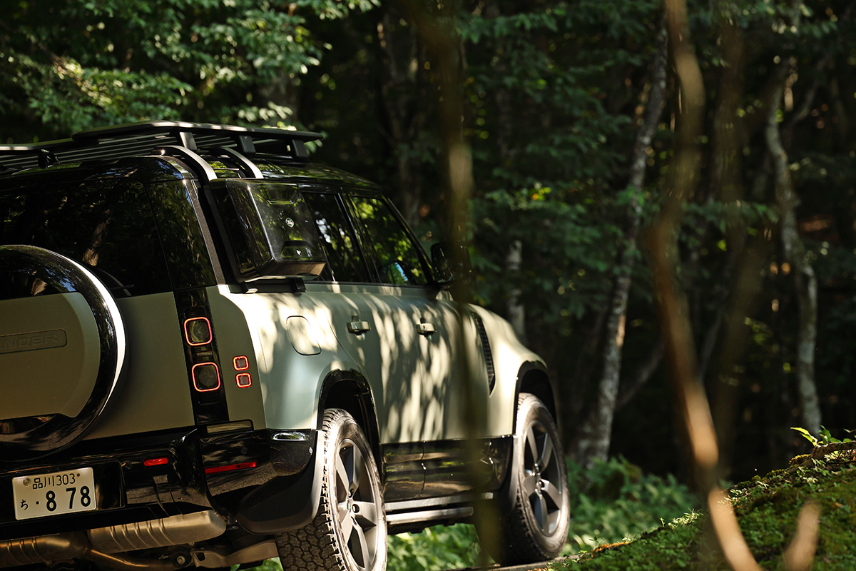 窓の外に深緑の稜線が広がり、大型のパノラミックルーフから差し込む光が車内に開放感をもたらす。高速を降り、県道からさらに奥まった忍野村の森へ。オフロードでも安定感あふれるトルクフルな走りは、まさにディフェンダーの真骨頂だ。