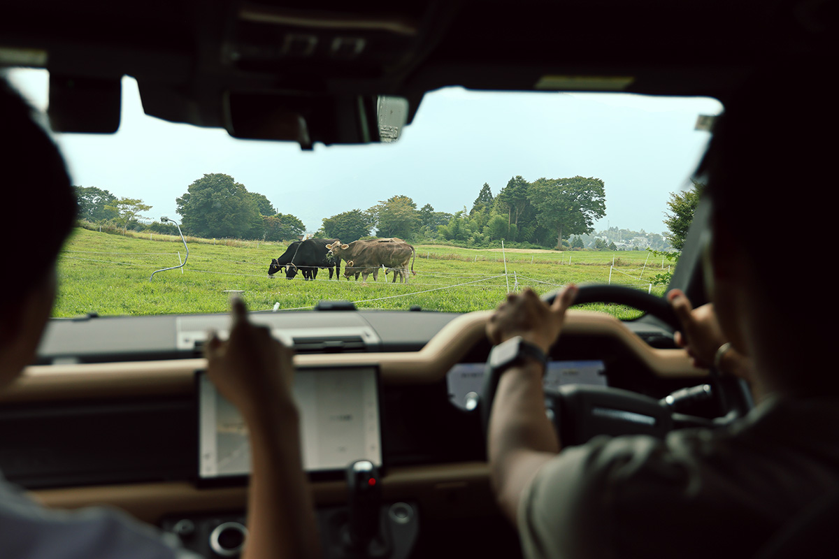 ローカリズムを徹底したnôtoriのコンセプトは、地域の植生に囲まれたスタイリッシュな建築や、富士山の五合目から上の溶岩や赤茶けた色をイメージしたレストラン空間にも表れている。一旦荷を降ろし、チェックインした後、二人から提案で地元の生産者の下へディフェンダーを走らせた。