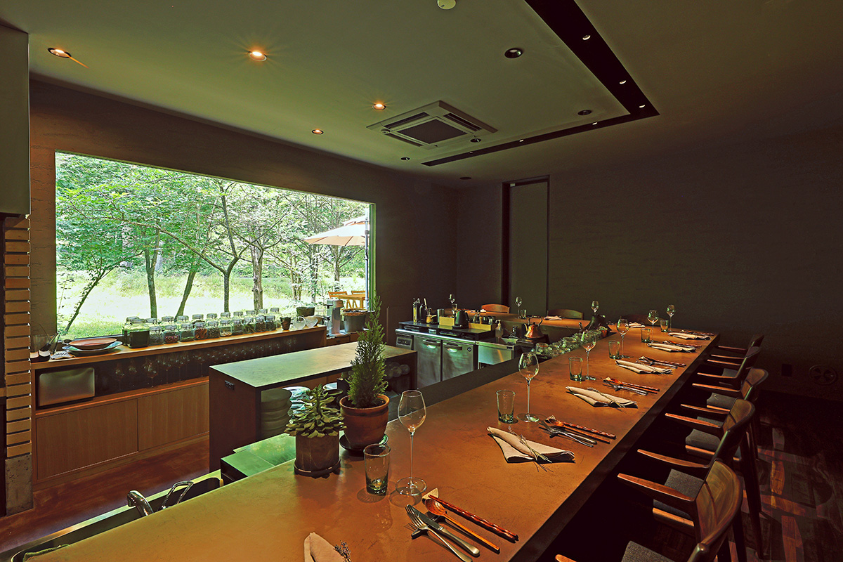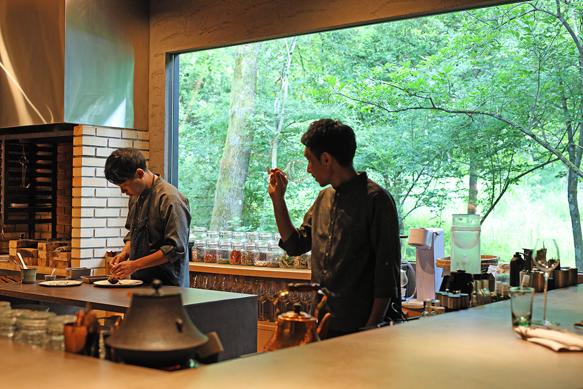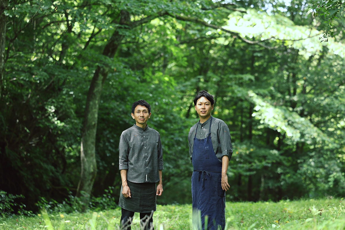 都心から約1時間半、木漏れ日が差し込む森と一体化したnôtoriにたどり着き、堀内さん兄弟と再会の喜びを分かち会う。そもそも二人が東京都心でも市街地でもなく、秘境の地でオーベルジュをはじめたのは、独自の“富士北麓キュイジーヌ”を実現したいという想いからだ。