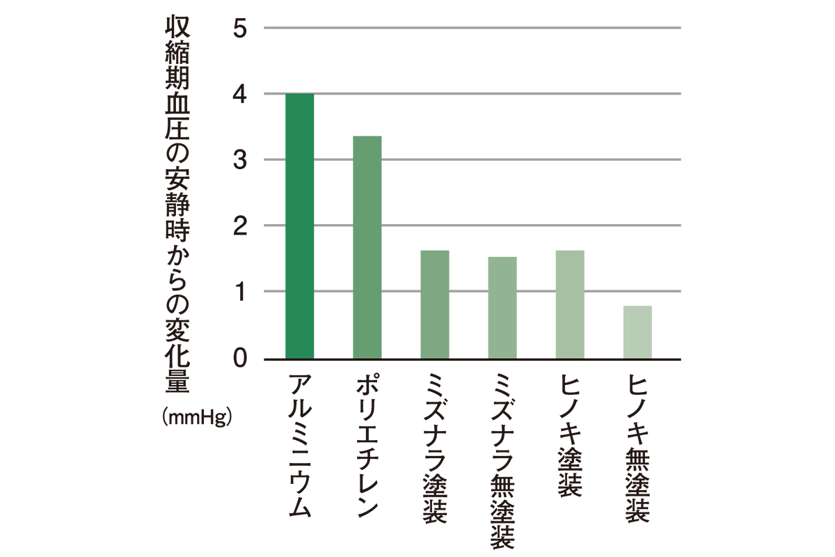 木材は中空の管が束になったハニカム構造で空気を多く含むため、熱伝導率が低く、触れた際に体温を奪われにくい。室温24℃の環境でさまざまな素材の手すりに触れた際の生理反応を測定した実験では、金属やプラスチックに触れると血圧が大きく上がるのに対し、木材では身体の熱の奪われ方が少なく、血圧の変化も小さいことが示された(上図)。このように、木材は身体への負担が少なく、ヒートショックの発生リスクを抑える効果も期待できる。