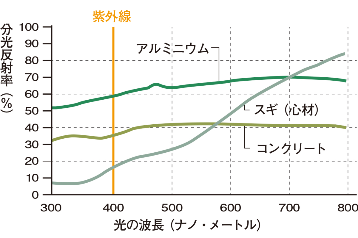 目に有害な紫外線をはじめ、紫から青色にかけての短波長の光を吸収する特性のある木材。実際に材料はコンクリートやアルミニウムに比べ、光に含まれる紫外線、紫・藍・青色光の比率が低いことが示されている(上図)。木材空間は、電球色に似た安らぎを感じやすい環境になっているのだという。木材は目にやさしい素材であり、最近注目されるブルーライトによる目への負担の軽減にも貢献しているのだ。