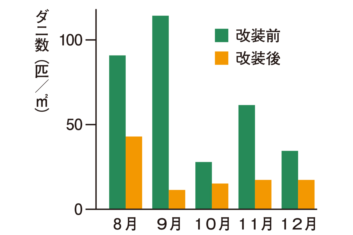 木の成分には防虫効果があるものも。特にダニに対しては、複数の研究でその効果が報告されている。たとえば鉄筋コンクリート造の集合住宅の床を、畳やじゅうたんから木に改装したところ、ダニの数が減少した(上図)。別の研究では、檜やヒバ、クスノキのチップ上で、ダニの活動が抑えられたという結果も得られている。木質化空間によって、ダニによるアレルギー性疾患の予防も期待できる。