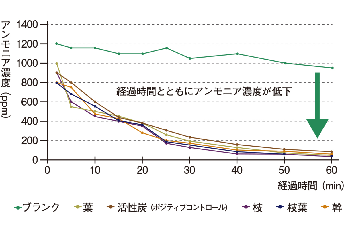 活性炭の消臭効果は有名だが、木の枝葉や木材チップもアンモニアなどの悪臭成分を吸着し、消臭効果があることが判明している(上図)。木材の成分には抗菌作用があるものも確認されており、杉の精油やその抽出物には食中毒などの原因となる黄色ブドウ球菌に対して強い抗菌活性があるという報告も。さらにトドマツ葉精油による二酸化窒素の除去効果についても報告があり、この効果を活用した空気清浄剤も商品化されている。