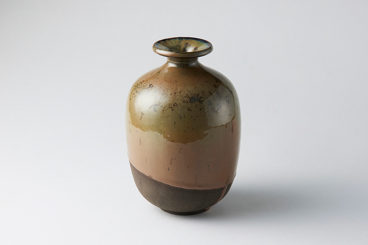 無機質で力強い素地に、つやのある飴緑釉がぽってりと。首がすぼまったかたちも相まって不思議な色気がある。