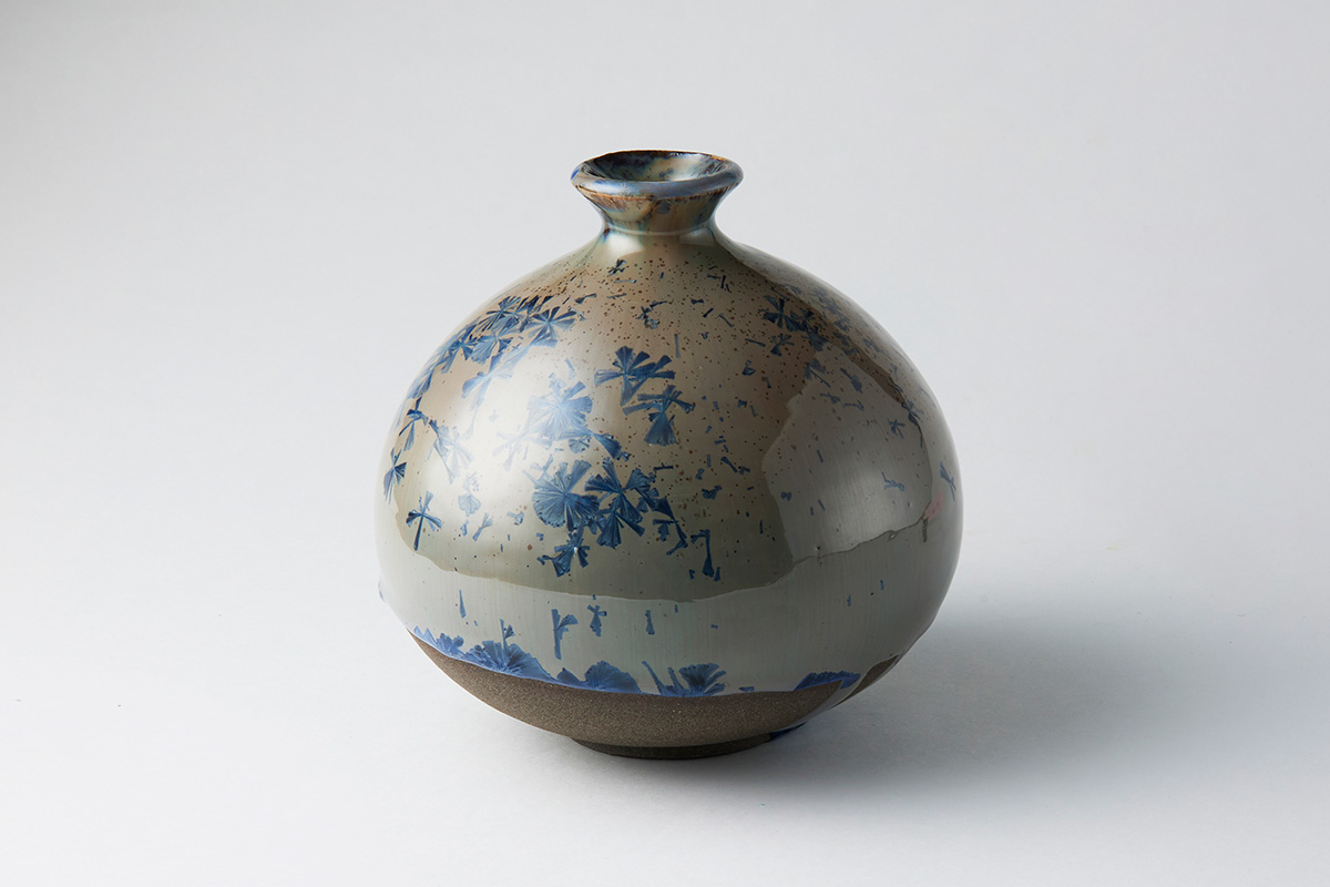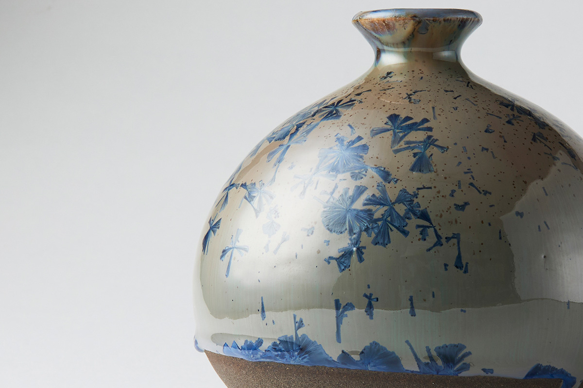 どっしりとした安定感のある壺。窯で焼く際の温度調整によって結晶が偶発的に析出し、時に鉱物のような表情になる。