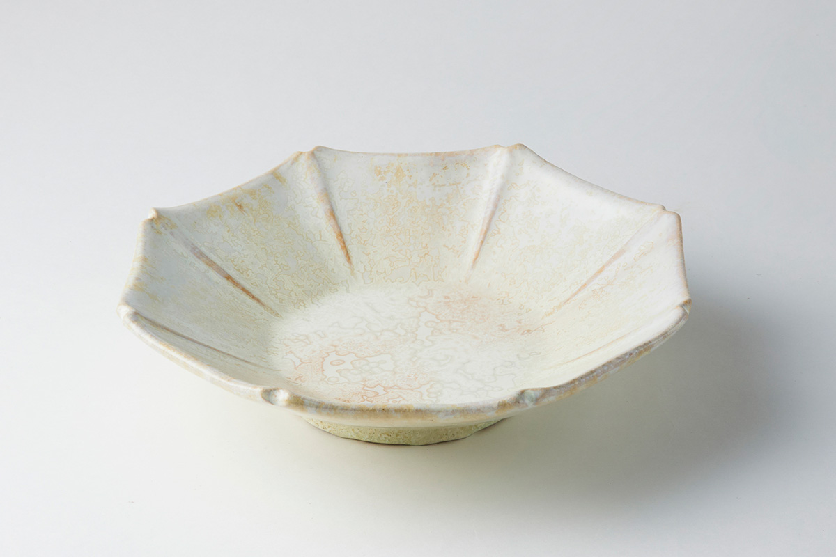 隅を切った八角形の盛り鉢。縁回りを立ち上がらせ、緊張感をもたせてある。和洋中を問わず料理を引き立てる。