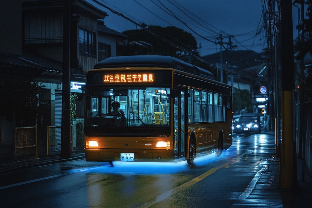 数々の名作映画の世界観をデザインしたアメリカ人デザイナー、ジェームズ・チンランド氏は、岡山市を通常ダイヤで走る路線バスを作品化。約60台がLEDでライトアップされ、乗客は気がつけば自分がアートの一部になる