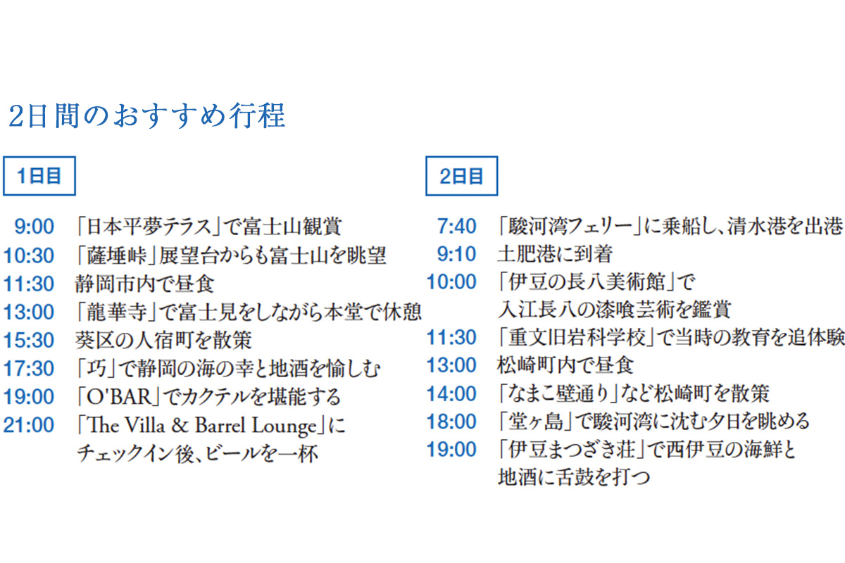 翌日は西伊豆へ。県道223(ふじさん)号と呼ばれる航路から富士山を堪能。西伊豆では、「近代教育に情熱をかけたしずおか人の結晶」を訪ねて松崎町へ。明治時代に建てられた擬洋風建築の校舎では、新時代の希望や教育に懸けた想いに触れることができる。また贅を尽くした“なまこ壁”の町並みを歩き、のどかな港町の繁華な記憶をたどりたい。