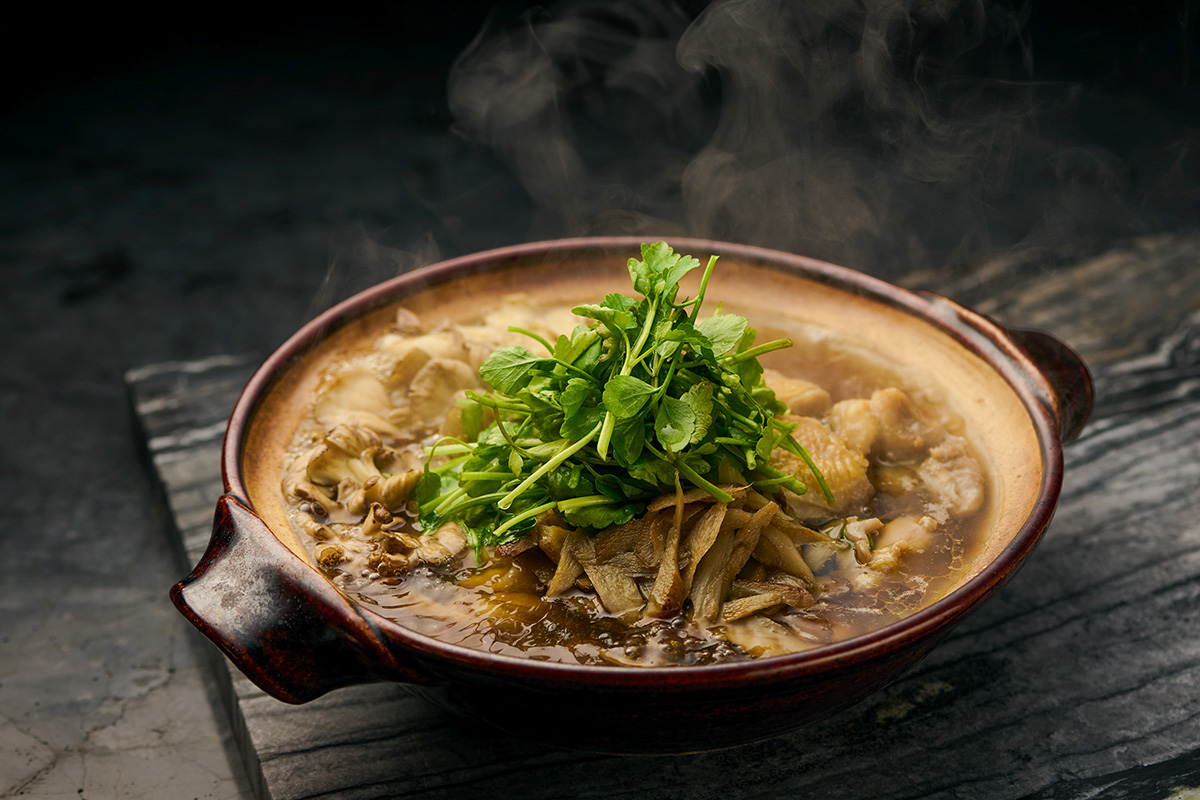 SIIDA®で取る出汁は濃厚で香り高いため、味付けは塩だけで十分。その分、旬の食材の持ち味を贅沢に堪能できる。香りの強いセリとゴボウ、マイタケといった具材の美味しさが加わり、寒い季節に心身を満たしてくれる。