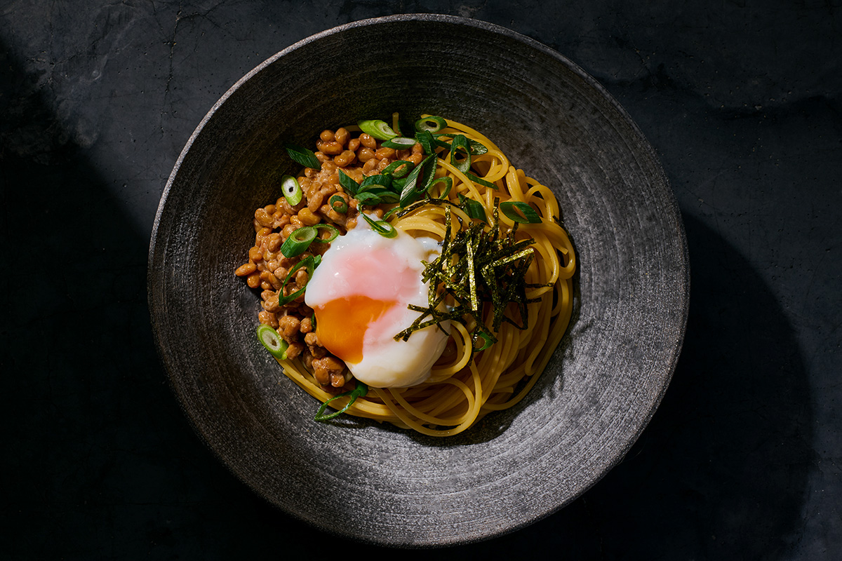 乾麺の状態から出汁をたっぷり吸ったパスタは、口に入れたとたんに鰹節のスモーキーな香りと深いうま味が広がる。個性の強い納豆に負けない力強い出汁感はSIIDA®︎ならでは。ほかの具材(しらす、大葉、明太子など)との相性を試してみて。