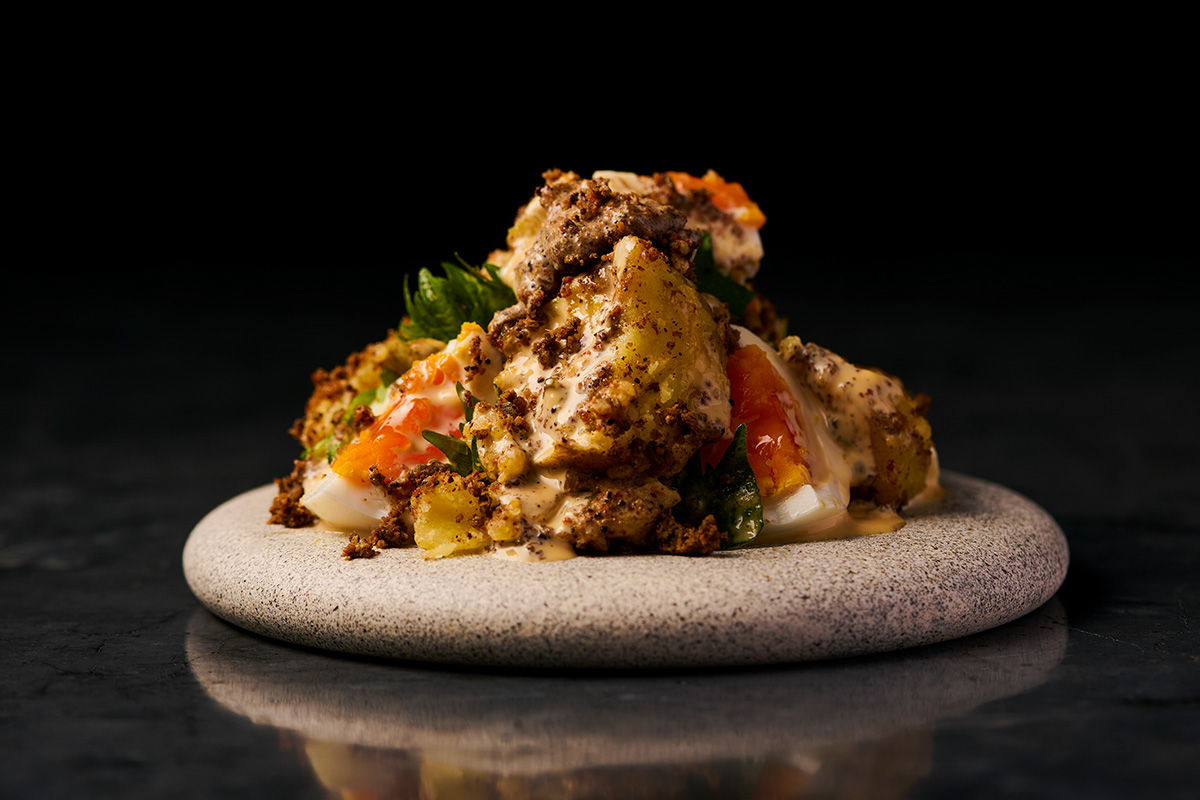 良質な素材を使うSIIDA®出汁パックなら、出汁がらも食材として使える。ジャガイモがふっくらとした出汁の香りをまとい、ほろほろとした出汁素材が食感のアクセントに。かみしめるほどにうま味が増し、燻(KUN)のスモーキーさがクセになる。