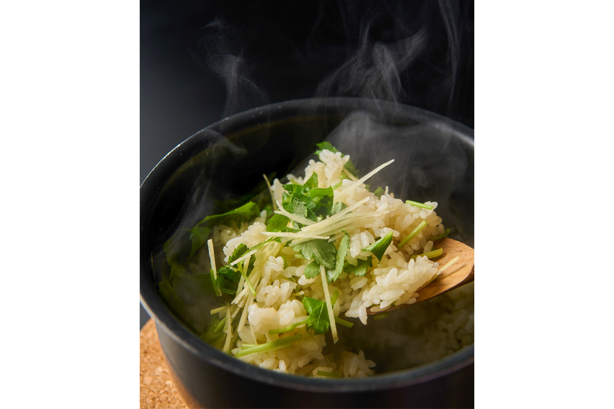 ③炊きあがったら三つ葉とショウガを加えて混ぜ合わせ、塩で味を整える。