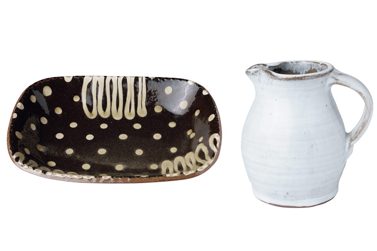 (右)地元の素材にこだわる岩美町「延興寺窯」のピッチャーは、もみ殻からつくる釉薬をまとった素朴な美が魅力。9350円