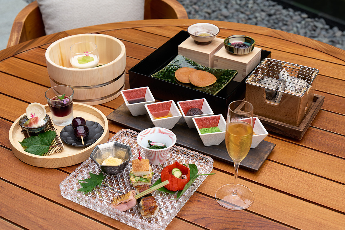 ビジターにも人気の高いアフタヌーンティーは、ホテルの世界観とシンクロする和の趣。フルーツを盛り込んだ大福や最中、七輪で炙って仕上げるどら焼きなど、ユニークなプレゼンテーションが楽しい。