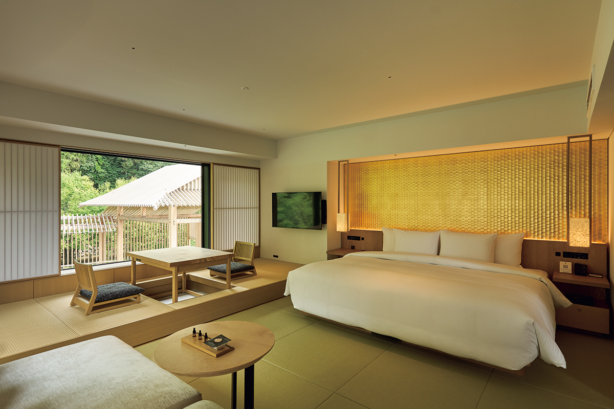 「幽玄」をコンセプトにデザインされた客室は、全52室。「ONSEN」カテゴリーの客室では、敷地内に湧出する天然温泉「京都東山温泉」をプライベートな空間で堪能できる。肌触りのいい単純弱放射能冷鉱泉の湯に浸かれば、ヒバの浴槽のふくよかな香りに包まれて極上の寛ぎを体感できる。モダンかつナチュラルなしつらえにも心癒されながら、古都でのひとときがゆったりと流れていく。