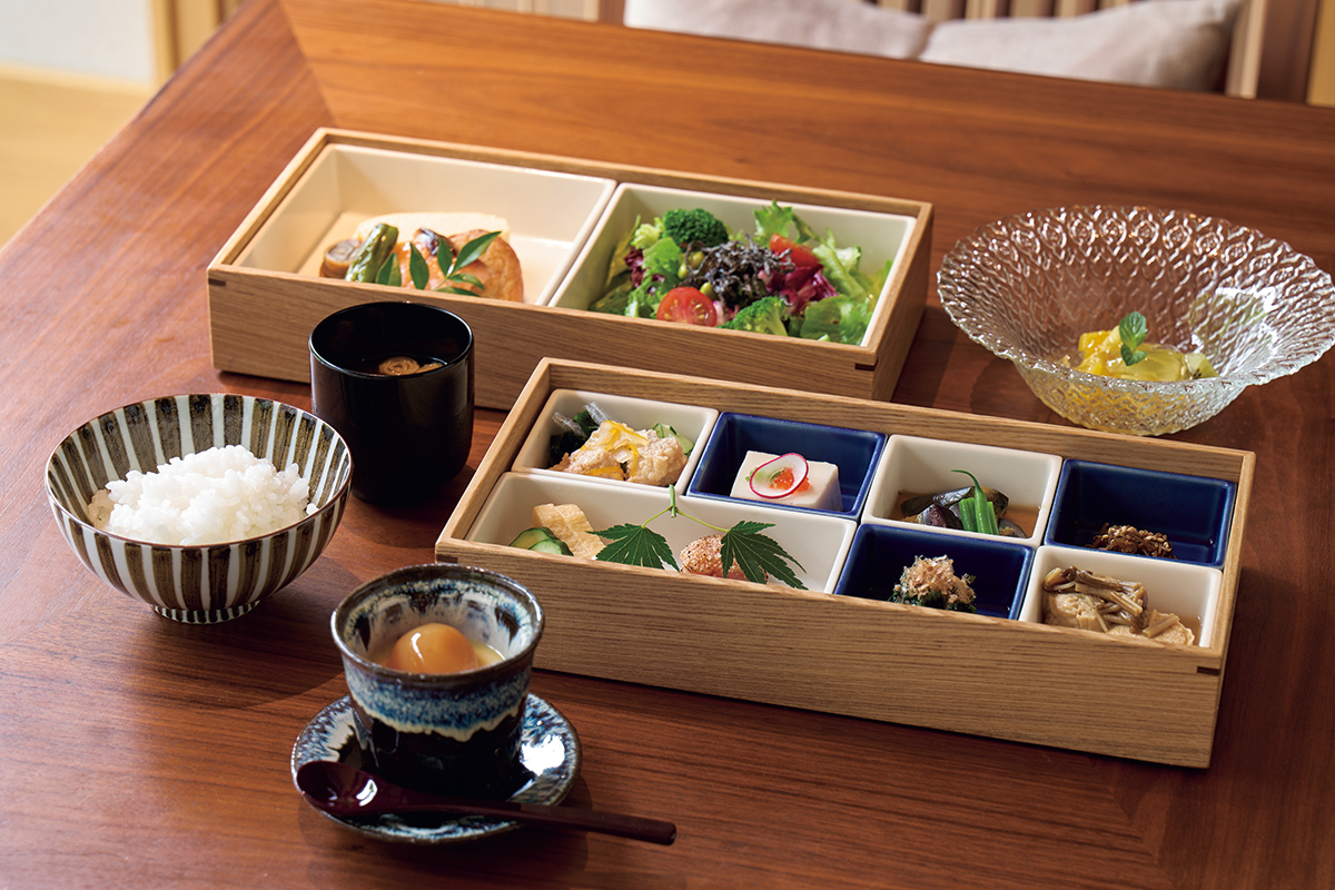 二段のお重を展開していただく朝食会席。名物の豆乳蒸し、しば漬けドレッシングのサラダ、巻き湯葉の煮物など、朝の身体に優しい品々ばかり。希望に応じてアメリカンブレックファストも提供可能