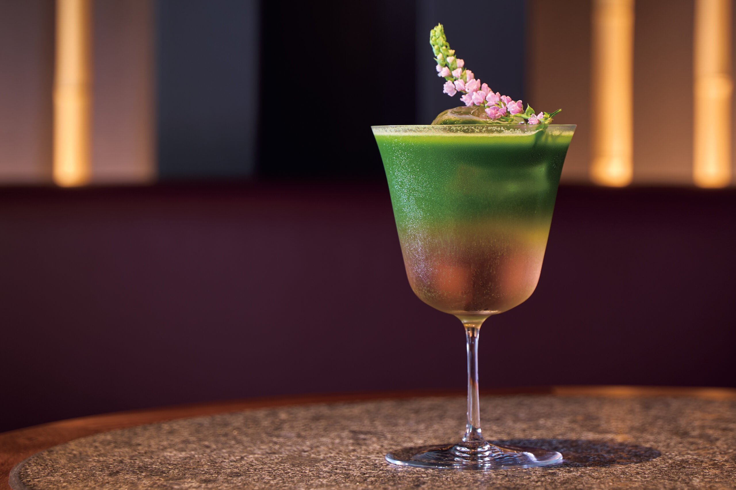 「BAR RYOZEN」のシグネチャーカクテル「サケ・シダクション」。2種の日本酒を組み合わせ、抹茶と桜の風味を重ねて芳醇で奥行きある味わいに。二層が幻想的な美しさ