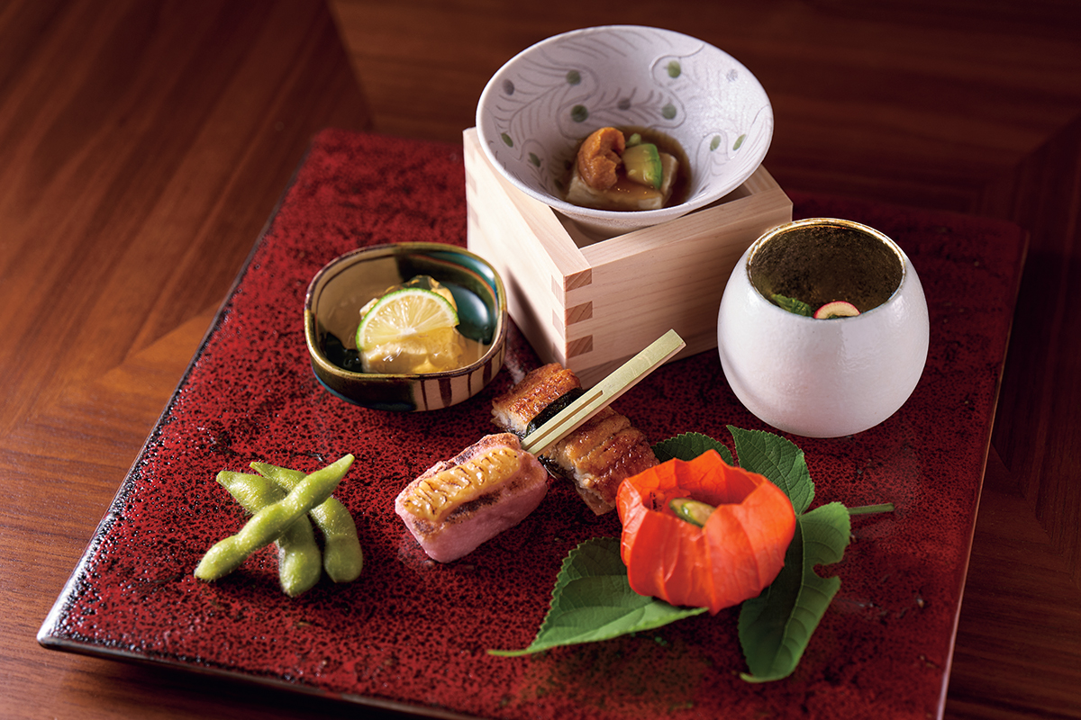 ディナーの「風姿会席」は、日本料理を軸にした、繊細かつ伸びやかな仕立てのコース。生命力を感じる食材の滋味深さと彩りの鮮やかさ、うつわ使いの優美さを通して、いまという季節を存分に味わいたい。