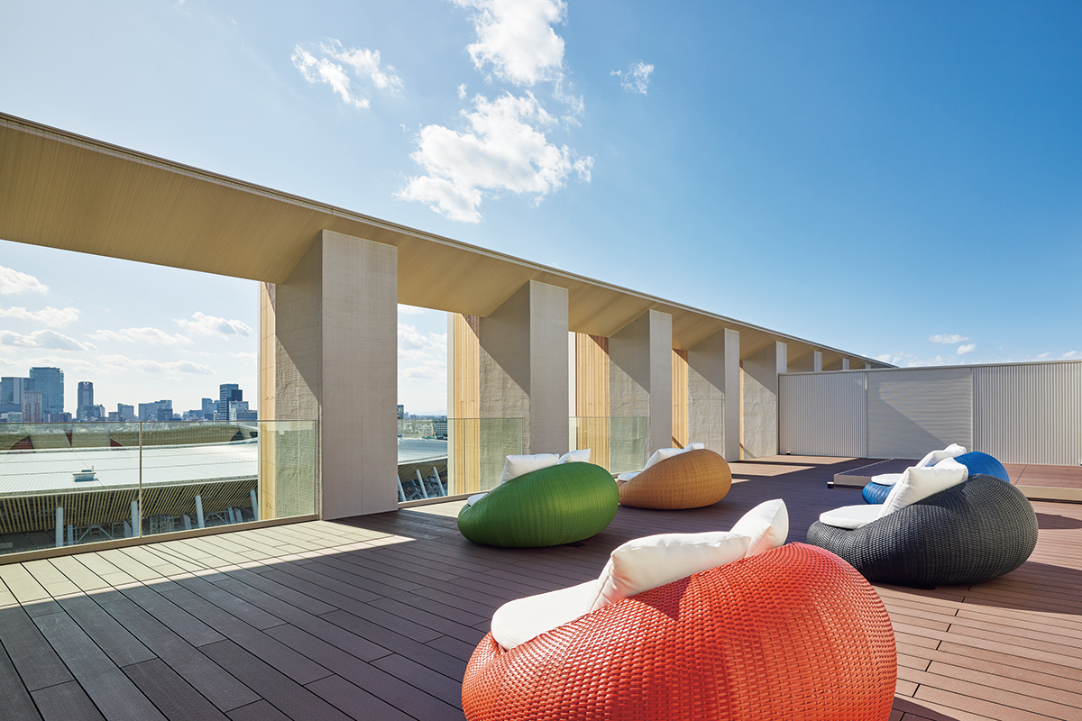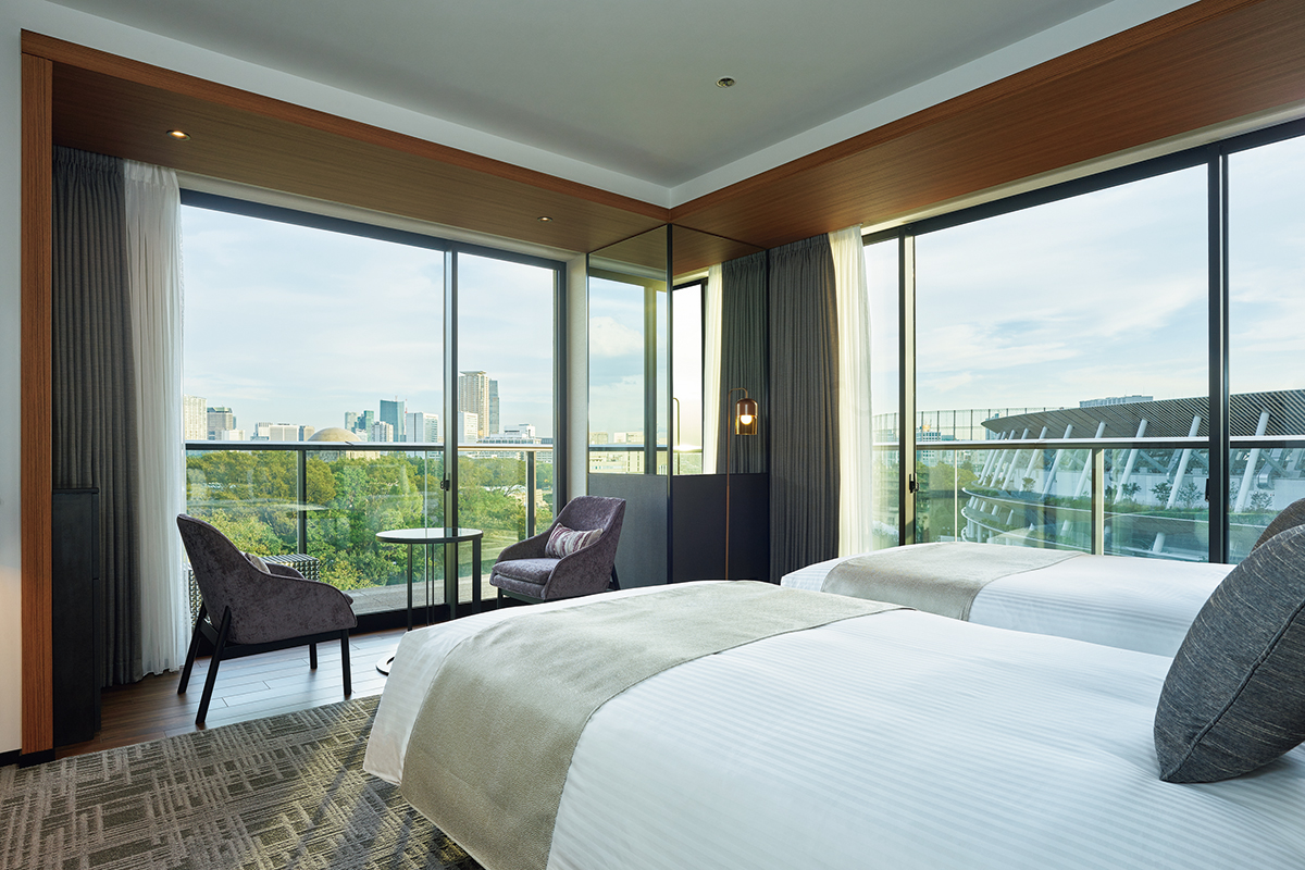 神宮外苑の杜や新宿御苑の豊かな緑に囲まれたホテルのコンセプトは「心澄む都心」。木を素材に、日本文化に息づく曲線を取り入れた美しい外観が周囲の風景と調和し、都心にいながら別荘で寛ぐようなホテルステイを楽しめる。レセプションロビーや客室では、「杜(過去)・水(現在)・光(未来)」がテーマのアートがゲストを迎える。