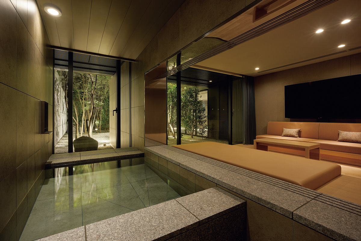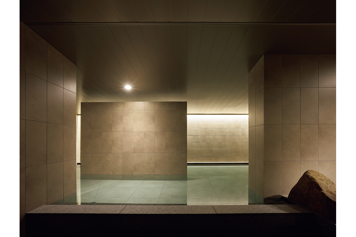 地下1階には、三井ガーデンホテルズとして初となる完全予約制のプライベートバス(上)と、洞窟のような空間が広がる約90㎡の大浴場(下)、そしてフィットネスルームがある。いずれも宿泊者専用施設で、プライベートバスは水着を着用しての利用もできる。