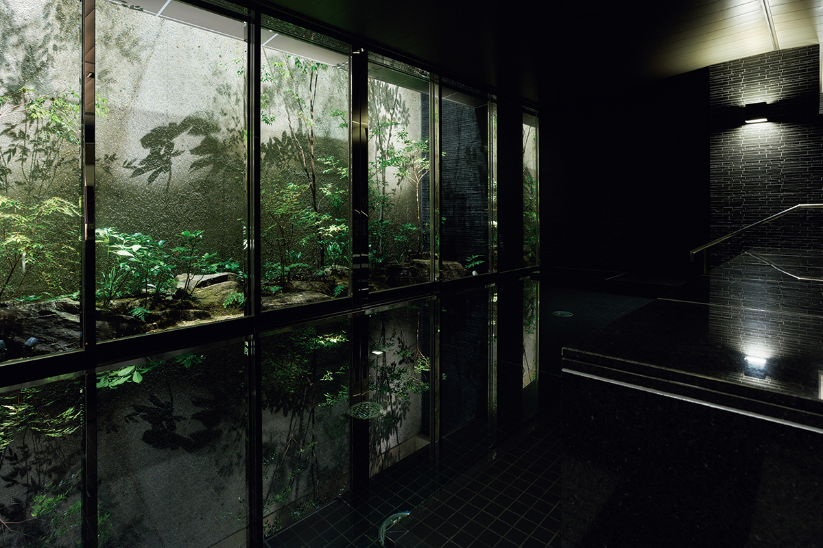 宿泊者専用大浴場は「古代の庭」がコンセプトの和モダンな空間。坪庭を観賞しながら、広々とした湯船に浸かれる。女性浴場にはパウダールームもある。