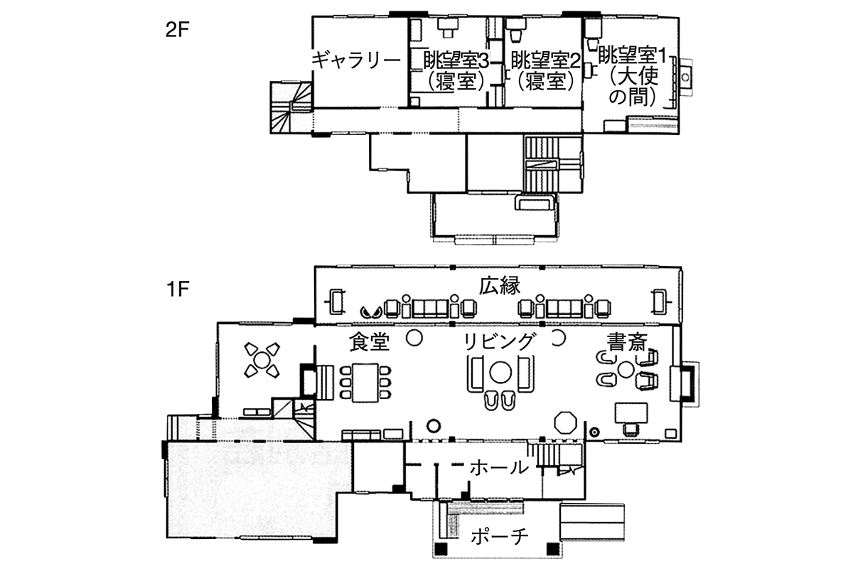 1階の中央にリビングが置かれ、その左右に食堂と書斎が配されている。屋内ポーチは、湖越しに山並みを一望できる全面開口部をもつ。食堂や2階の寝室には専用の動線が用意されている。