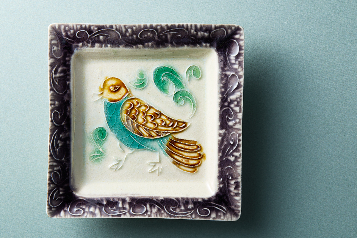 「ペルシア陶器や中国陶器にインスパイアされた、目にも楽しいうつわを目指しました」と、江口智己さん。愛嬌のある小鳥が印象的。5つの色を取り入れた鮮やかな向付は、釉薬の濃淡が作品に奥行きを与えている。中でも縁部分に起用した紫が、全体を上品な雰囲気にまとめ上げている。