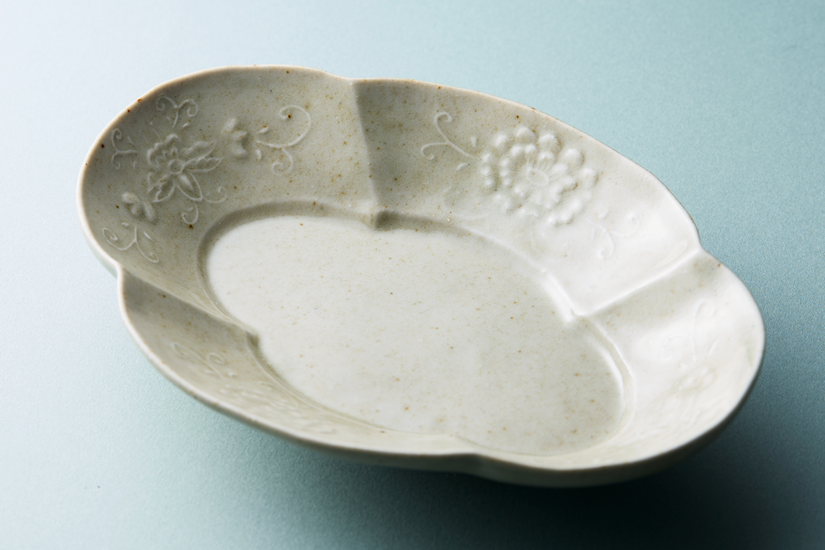 茶席や料理店などで使われることが多く、細部にこだわる分、制作に気が抜けないところが難しくもあると、鈴木しのぶさんは言う。今回の作品は、灰釉による優しいグレー色が印象的。縁に浮き出た陽刻は、牡丹と蘭がモチーフになっている。どちらも縁起のよい吉祥文様で、もてなしや祝いの席をはじめ、さまざまなシーンで活躍する。