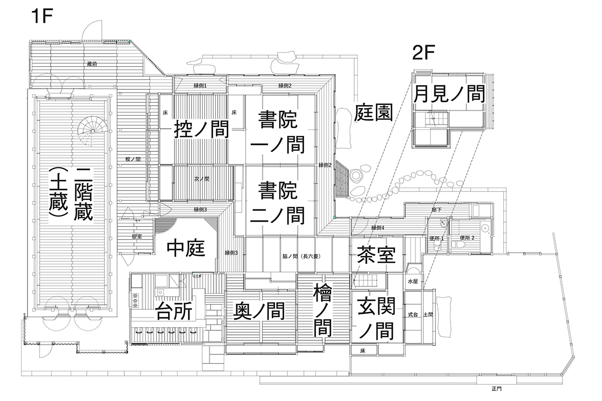 庭園を望む書院は「みんなのリビング」、隣接する和室は「みんなの図書館」として活用。奥ノ間は若狭塗箸のショップ、台所はコーヒースタンド、土蔵はミュージアムへと転用。
