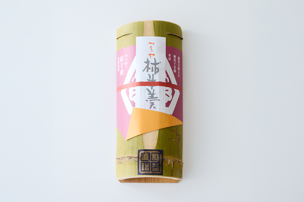 今回ご紹介するのは1755年創業の老舗「御菓子つちや」の銘菓「柿羊羹」。竹が容器に使われるようになったのは、5代目祐斎の代の1896(明治29)年からです。当主の親友で竹の研究家である坪井伊助翁が「竹と柿は相性がいい。柿を植えると竹も育ち、柿も甘みを増す、一挙両得」のアドバイスを得て、柿羊羹独自の竹の容器を考案したそうです。