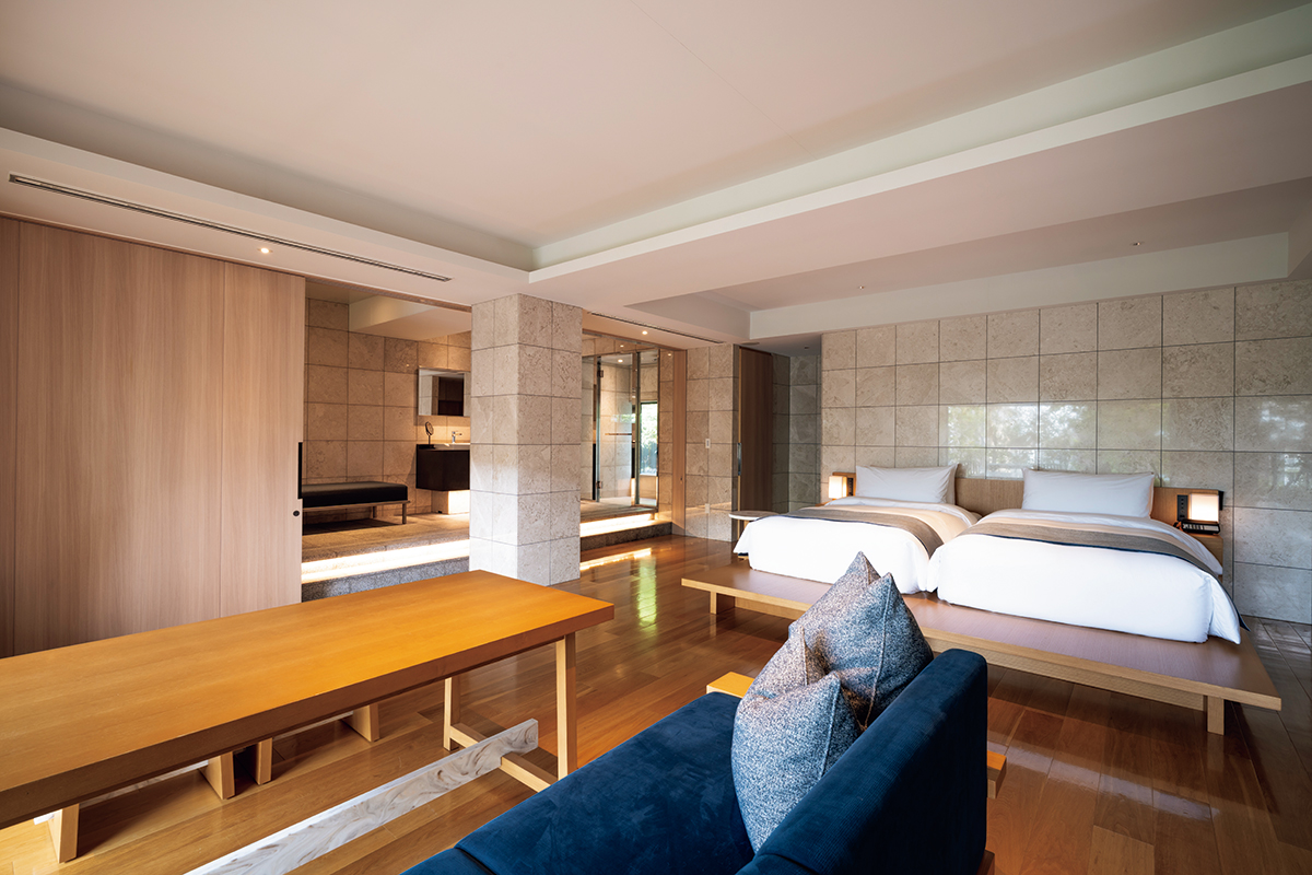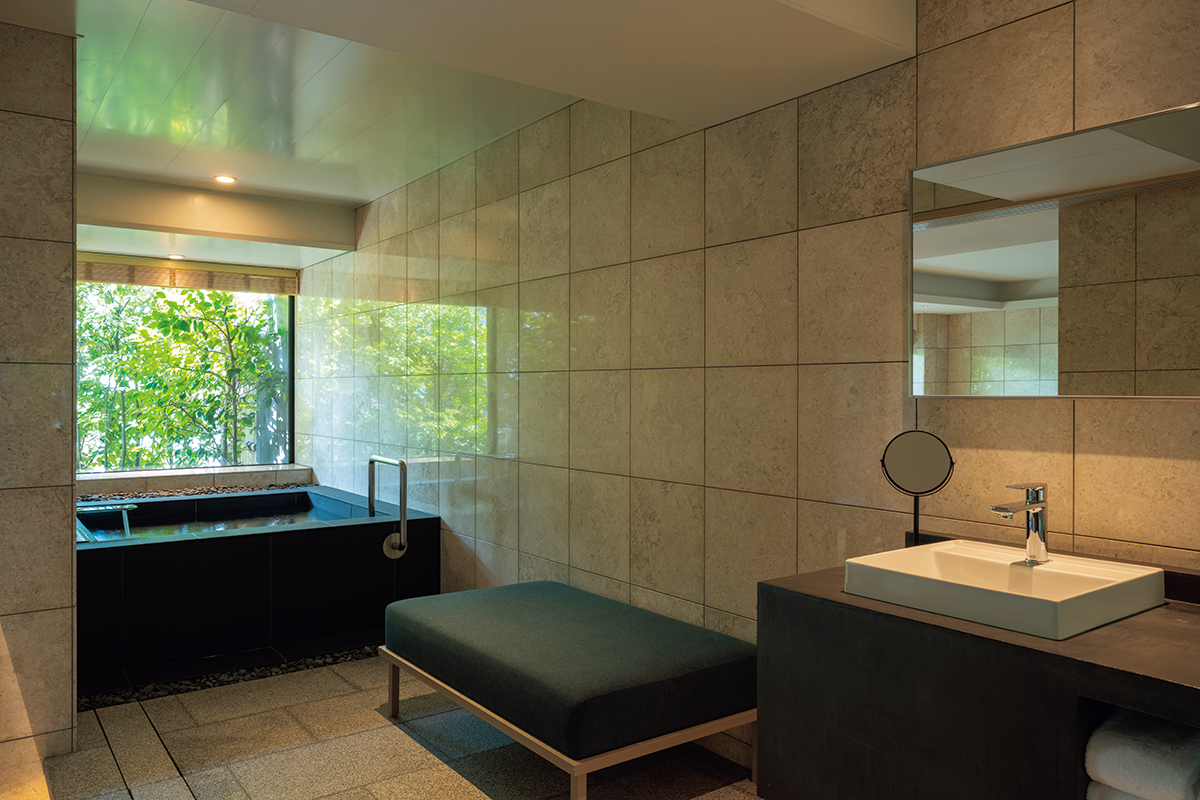 「ハーモニー・スイート」なら、スタイリッシュなリビング&ベッドルームから坪庭を、バスルームからは庭園を眺めて季節を感じ取ることができる。
