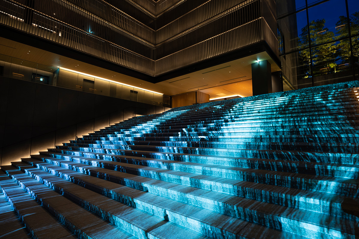 京都の神社仏閣をイメージした、どこか厳かでドラマチックな表情の大階段が、日が落ちればアートの舞台に。作品は、京都の自然から着想した「インタラクティブアート×プロジェクションマッピング」。京都を流れる河川や、穏やかな雲と風の移ろいなどを表現した3つのタイトルで構成される。人の動きに呼応して変化する仕掛けを通して、自分がアートの一部になるような体験も。デジタルと風土が融合した幻想的な作品に引き込まれ、見飽きることがない。この規模の大空間があってこその楽しい試みだ。