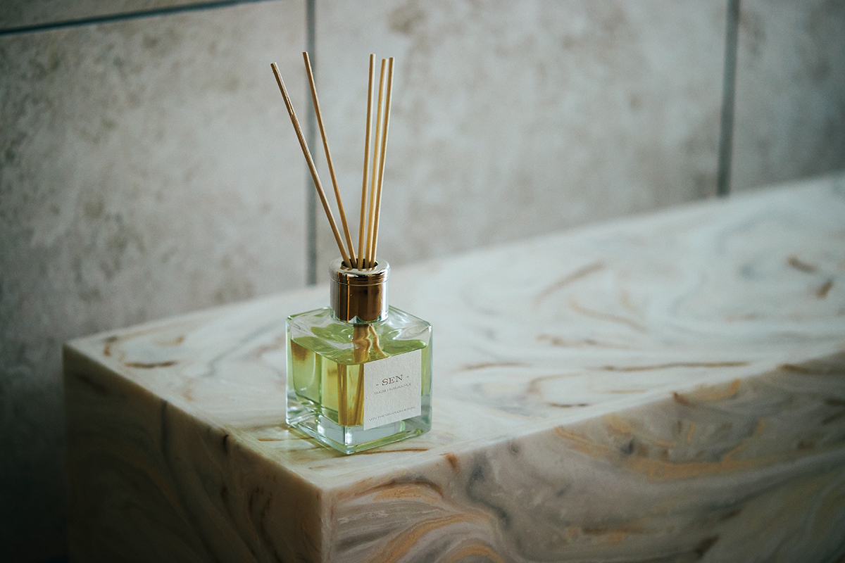ホテルのイメージに合わせて檜やペパーミントなどを調合したアロマ「リードディフューザー -SEN-」(8400円)を販売。館内の心安らぐ香りを自宅でも