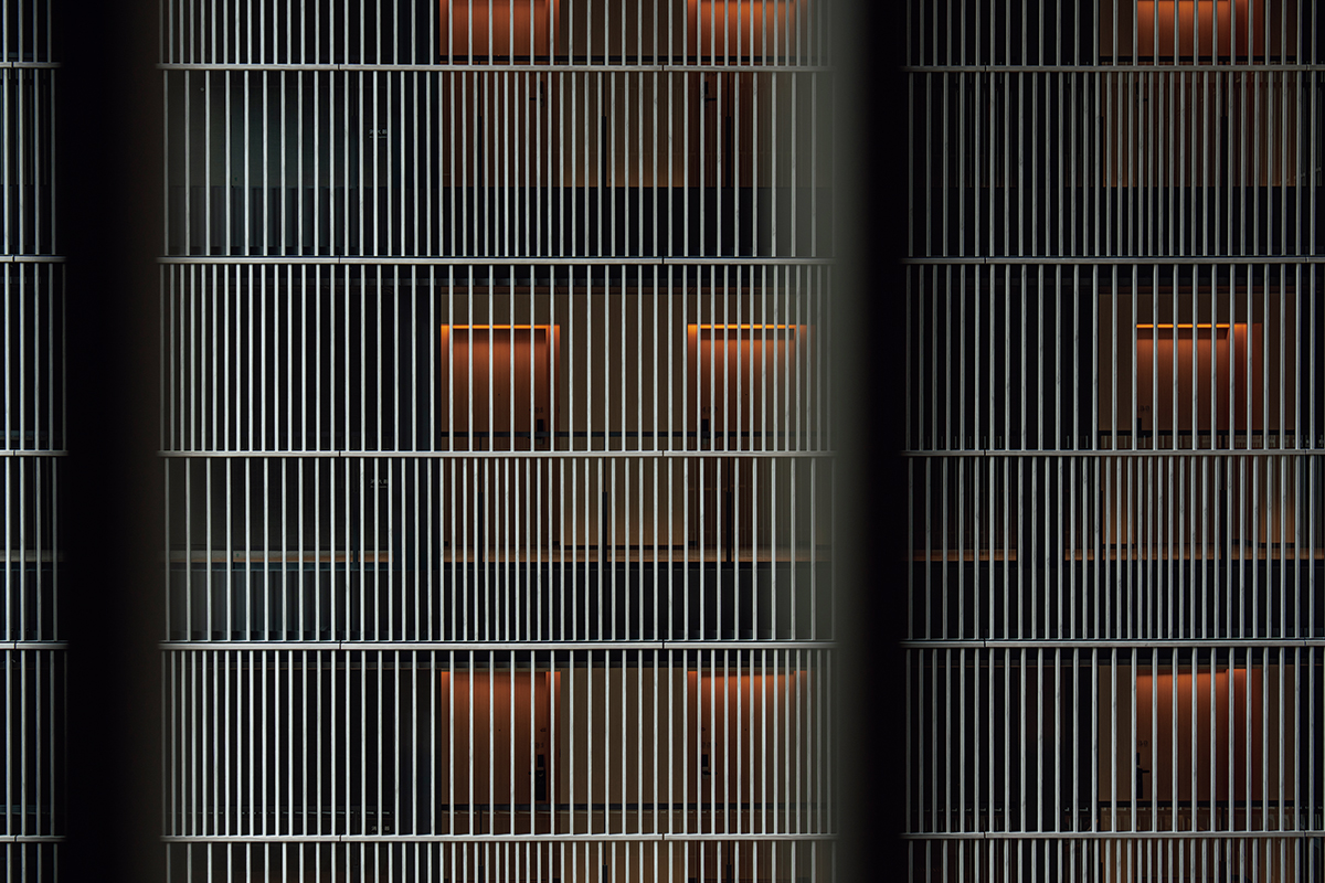 吹き抜け空間を囲む格子。あえて粗密を混在させ、柔らかな印象に。昼は自然光が陰影をつくり、夜は内側の客室フロアからほのかに光が漏れる
