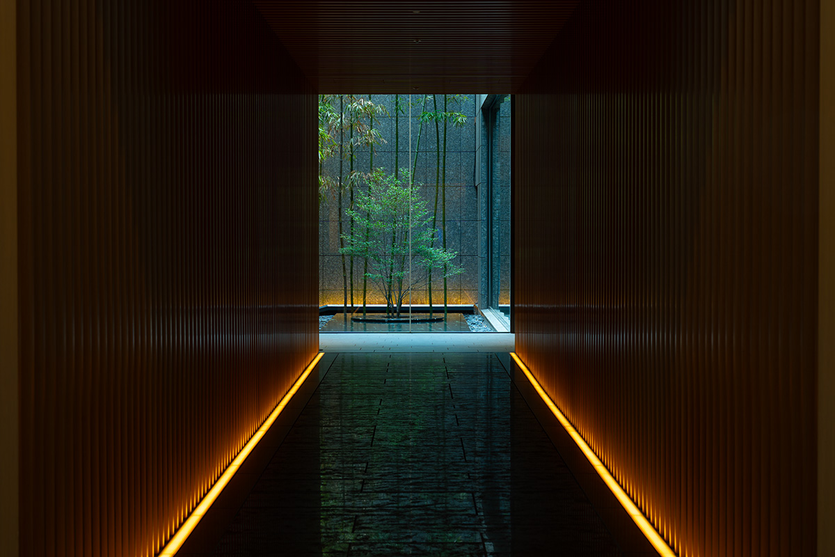 アプローチには京町家に特有の「庭」の概念が込められている。まず入り口の「前庭」を通り、「坪庭」の緑を感じながらさらに奥へ。木の格子で囲まれたトンネル状の通路「通り庭」を抜けるとそこには、正面に大階段を構える「中庭」が。そして緑萌える「奥庭」。京都で継承されてきたリズムが、モダンな建築に落とし込まれている。中庭にあたるロビーは、高さ約23m、6階までの吹き抜けが圧巻。木質の格子が客室フロアを覆い、大きな窓から入る自然光に照らされて柔らかな陰影をつくる。