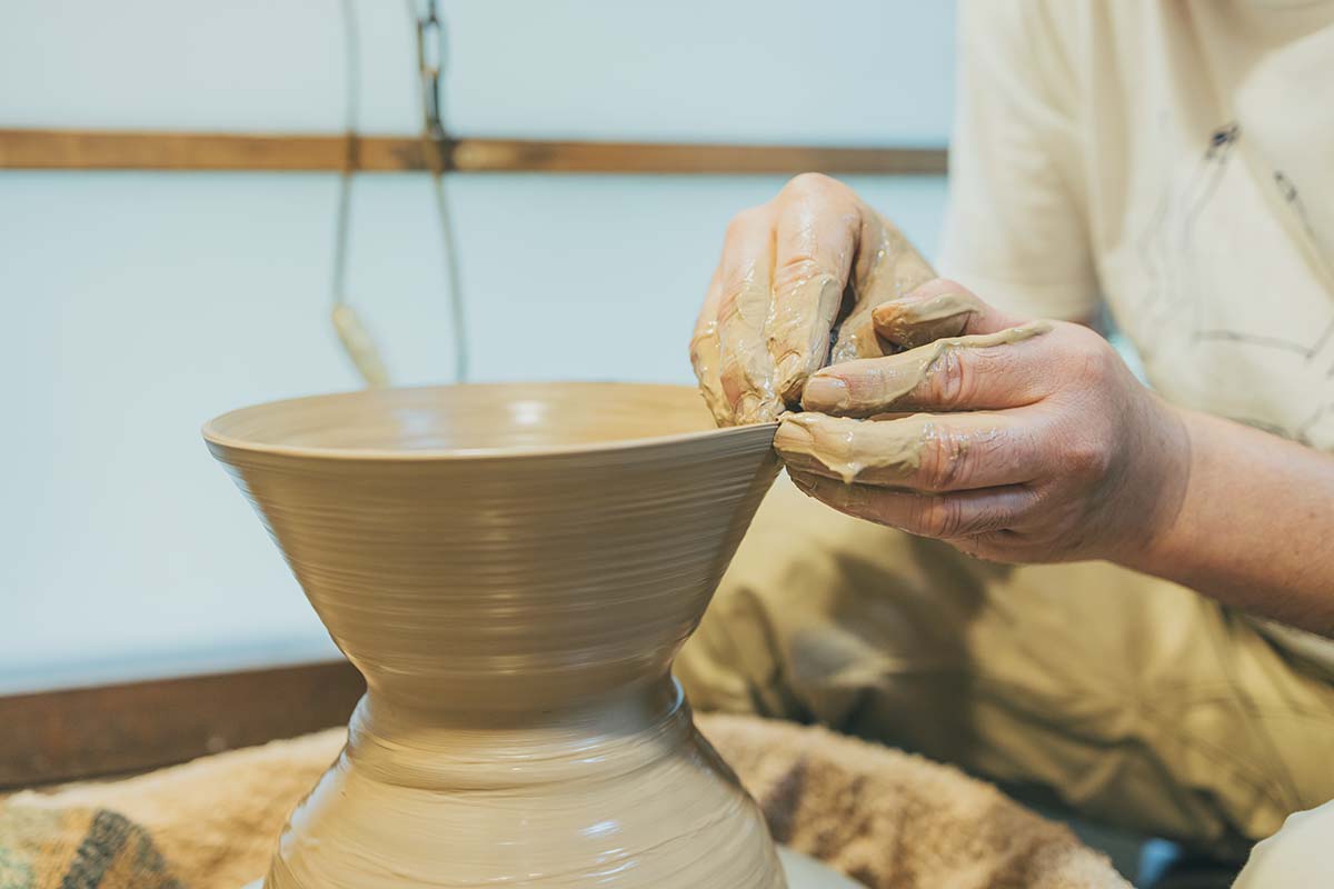 「気を抜くと、つい癖でうつわが薄くなってしまうので、ろくろ作業は思い通りのかたちになるよう、かなり集中しています」。