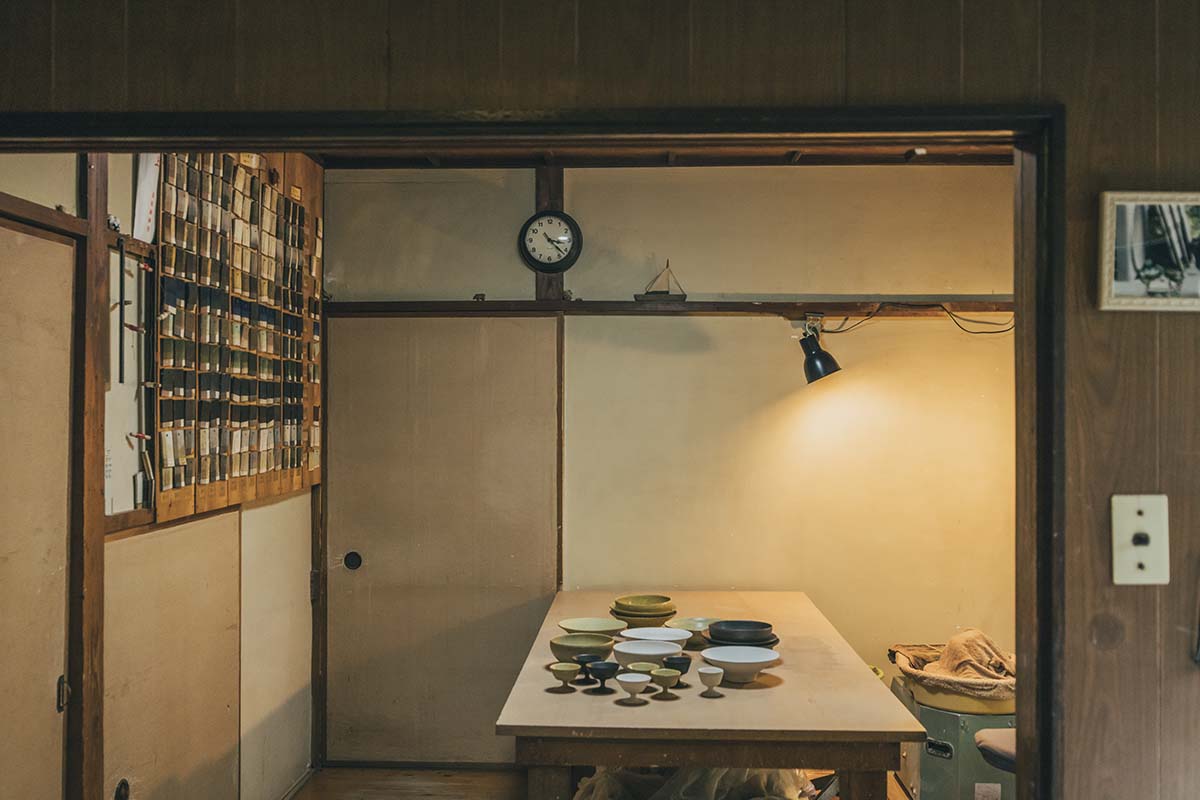 鎌倉の由緒ある土地に、いかにも猫が好みそうな細い路地がある。アセビさんの工房は、その路地の奥。築70年ほどの一軒家は昭和の面影を残し、玄関先にはアセビの木が植えられている。庭に面した部屋の一角がろくろ場で、同じく陶芸家の妻・キクタヒロコさんと制作をともにする。窯は庭の倉庫を改装したスペースに置かれている。暮らしのすぐ隣に仕事場があるといった印象だ。